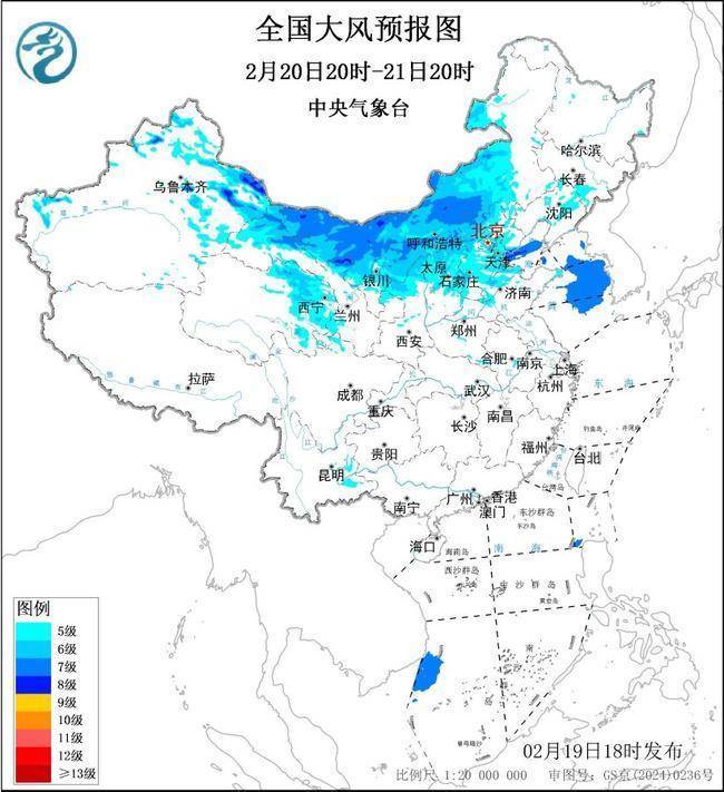 2月20日20时至21日20时,新疆东部、内蒙古大部、青海东部、甘肃大部、宁夏大部、陕西北部、山西中北部、河北大部、北京、天津、山东北部等地的部分地区有5~8级风,阵风9~10级。渤海部分海域、黄海中东部海域将有7~8级、阵风9级的大风。