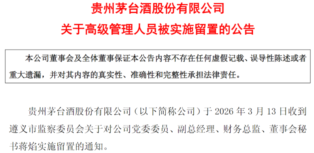 同日,贵州茅台发布公告说明,已收到遵义市监察委员会对于对蒋焰实施留置的见知。