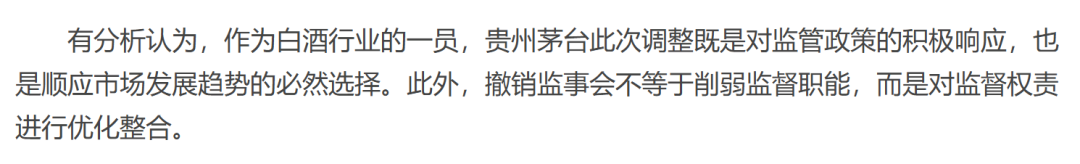 据《逐日经济新闻》报谈,有分析以为,算作白酒行业的一员,贵州茅台这次调遣既是对监管政策的积极反映,亦然稳妥阛阓发展趋势的势必聘请。此外,打消监事会不就是放心监督职能,而是对监督权责进行优化整合。