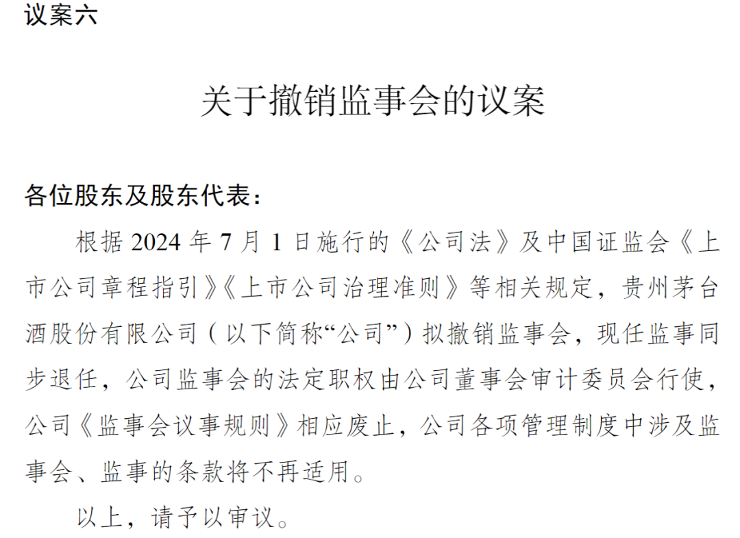 2025年11月,贵州茅台召开临时股东大会,审议通过了《对于打消监事会的议案》。证据议案,拟打消监事会,现任监事同步退任,监事会的法定权力由董事会审计委员会哄骗。