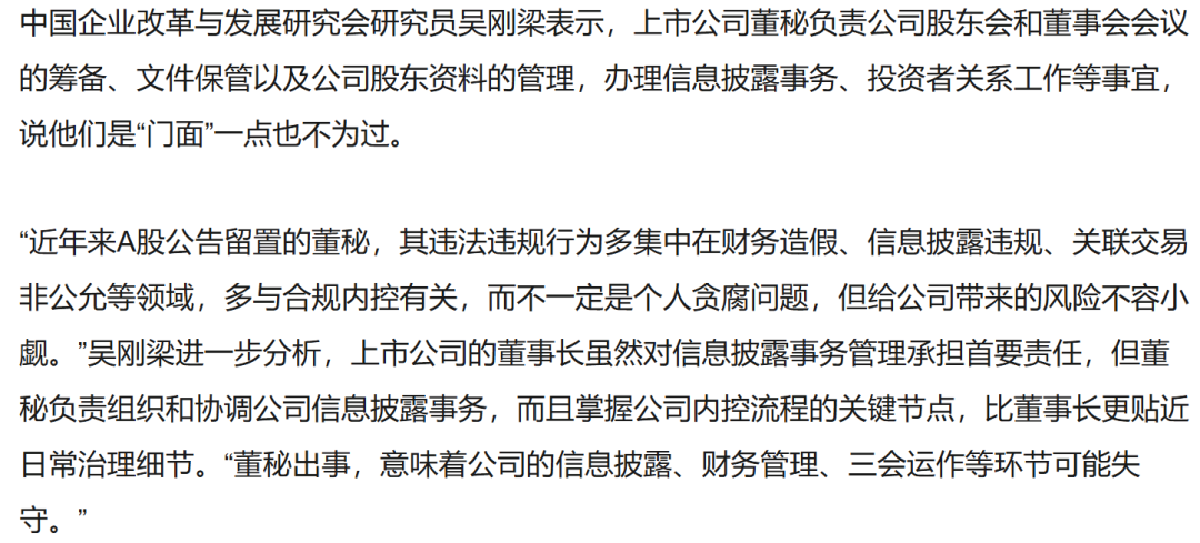 吴刚梁进一步分析,上市公司的董事长固然对信息败露事务治理承担重要连累,但董秘负责组织和互助公司信息败露事务,何况掌合手公司内控经过的重要节点,比董事长更逼近以前治理细节。“董秘出事,意味着公司的信息败露、财务治理、三会运作等步伐可能失守。”