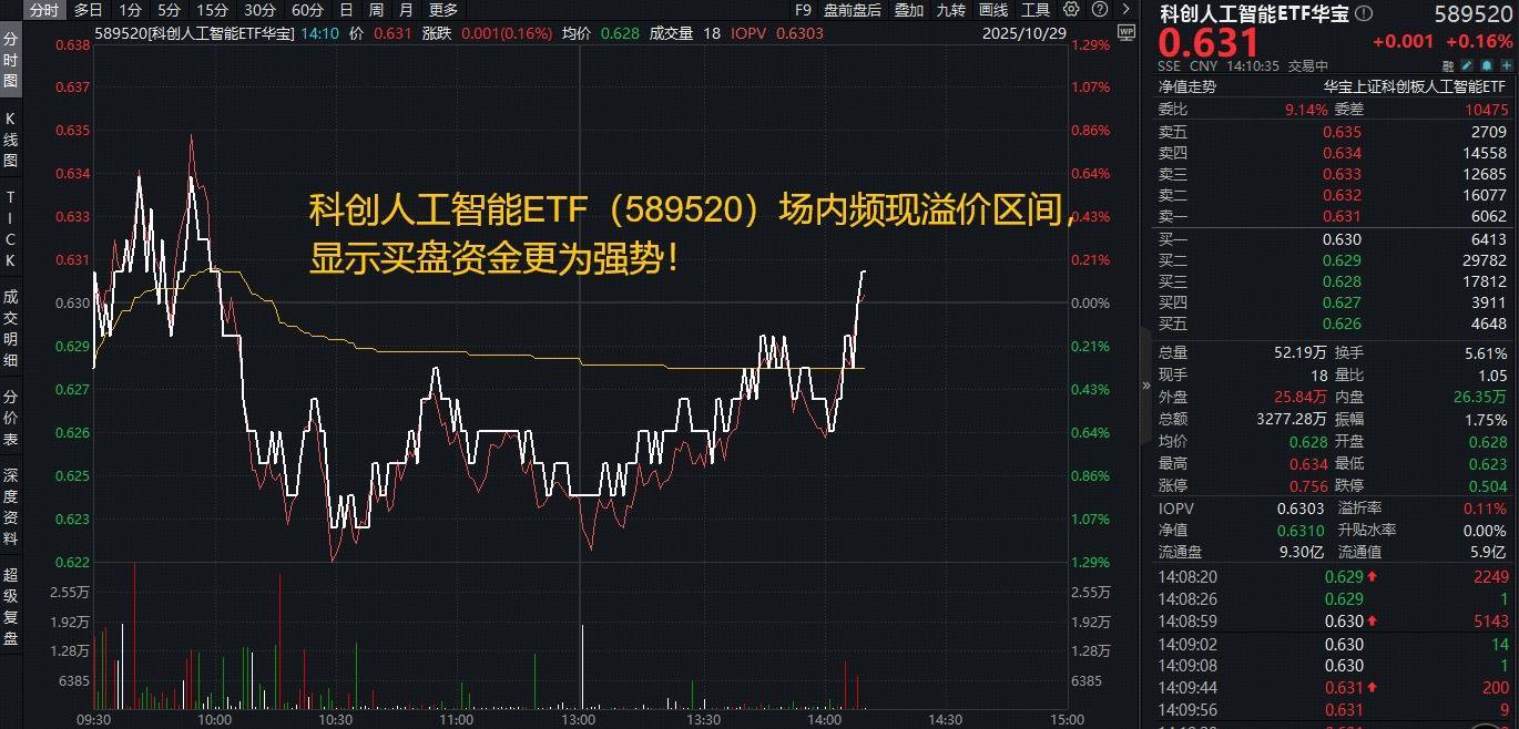 盘面上,本日(10月29日)重心布局国产AI产业链的科创东谈主工智能ETF(589520)在水面隔邻颤动,场内涨幅盘中摸高0.63%,现涨0.16%,场内频现溢价区间,袒露买盘资金更为强势。