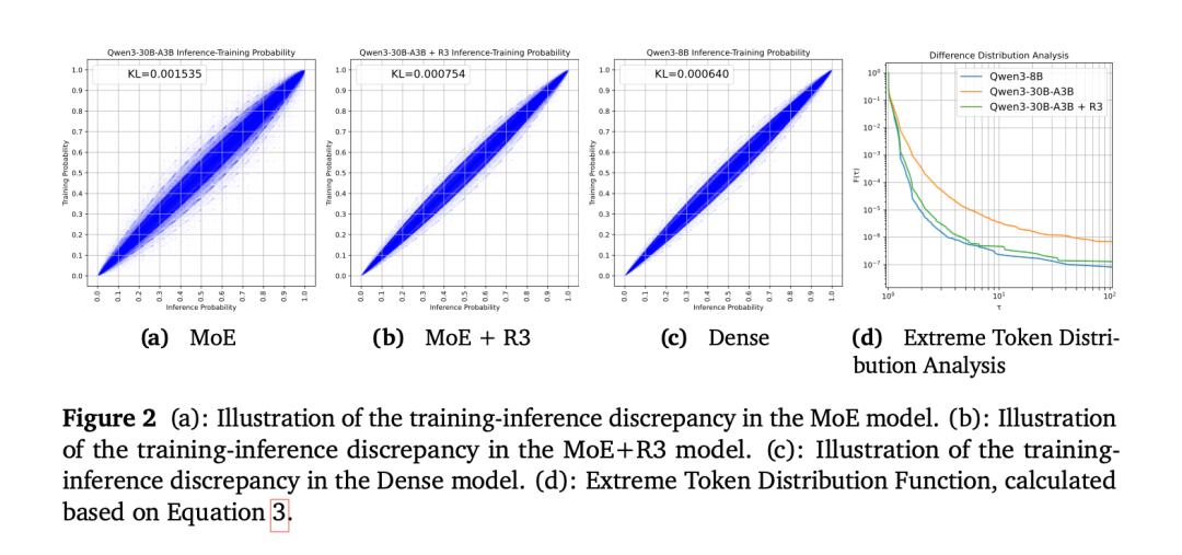 打算东说念主员建议的 R3,其使命旨趣是在序列生成技能从推理引擎拿获路由漫步,并将其获胜重放到锻真金不怕火引擎中。这已经由不错减轻锻真金不怕火和推理之间的差距,其显赫特征是不同引擎生成的逻辑向量的 KL 散度(量化两个概率漫步之间的相反进程,值越演义明两个漫步越接近)显赫裁汰,两个阶段之间概率相反显赫的 token 数目减少了大要一个数目级。