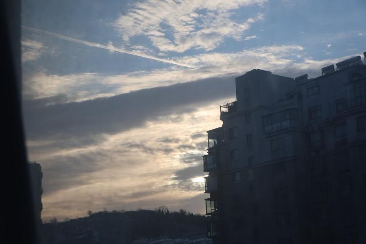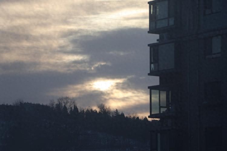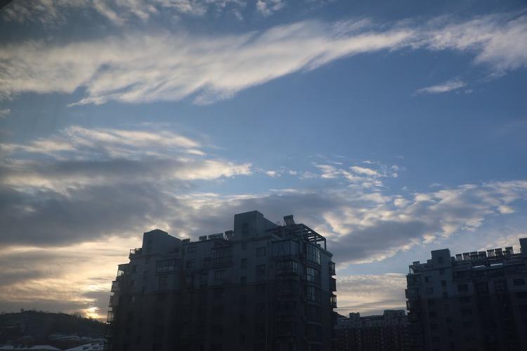 12月14日清晨,济南东部天外乌云朵朵,在野阳映照下,与地上的林野、高楼相照顾,犹如一幅幅考究的丹青。
